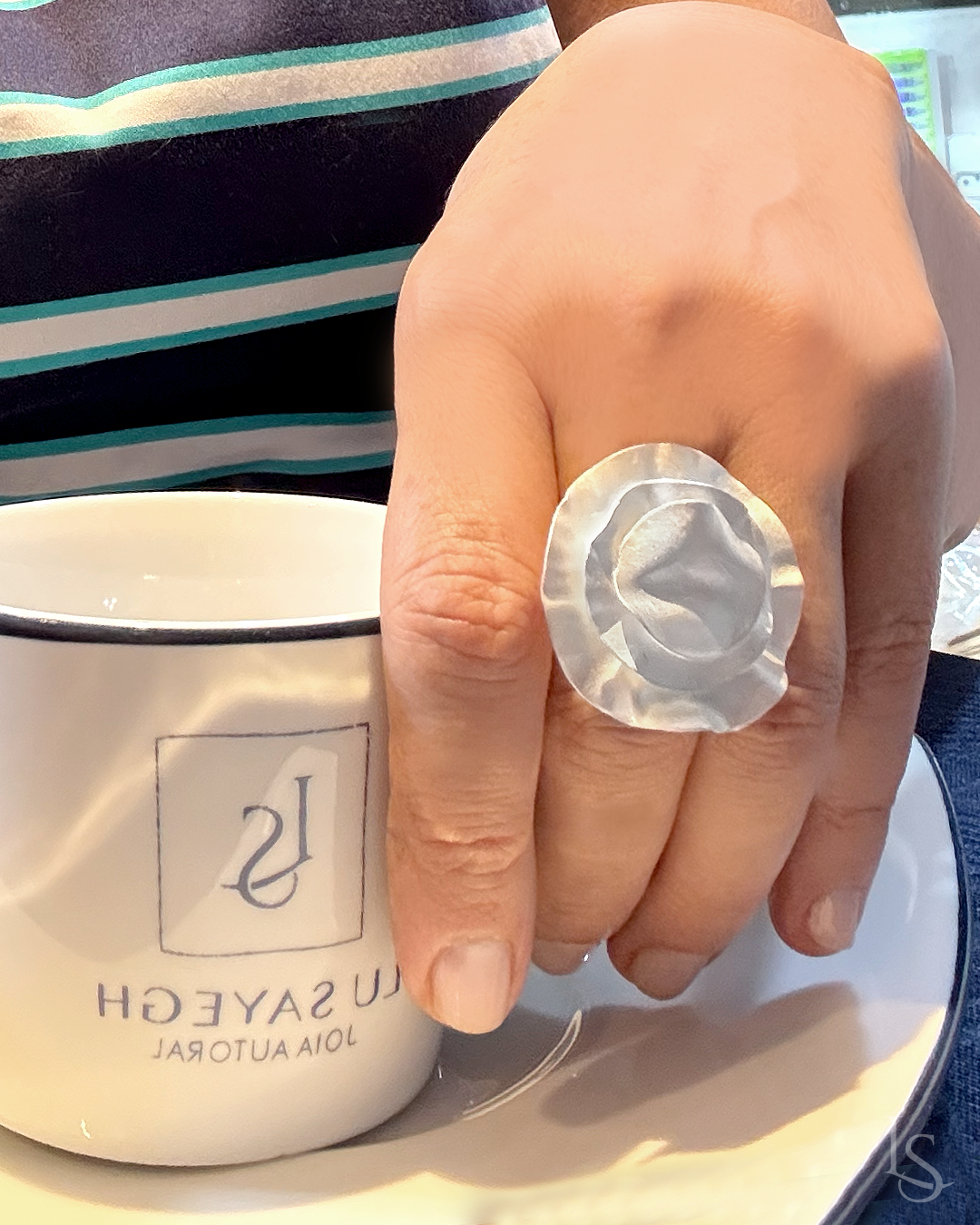 Esse anel é uma peça de presença marcante, as camadas são feitas em prata pura e o aro em prata 950, ele nasce de um gesto orgânico, moldado pelo toque e delicadas ferramentas manuais, como se tivesse sido construído pelo tempo ou pela própria natureza.