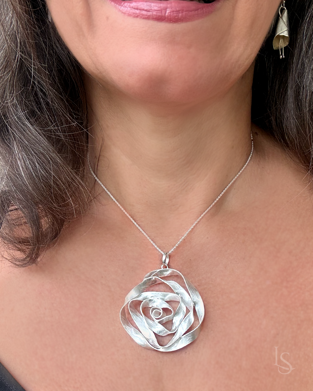 Joia única e diferenciada desenhada e elaborada artesanalmente pela designer. Em suas mãos uma fita de prata pura, é trabalhada com o auxílio do fogo e de pequenas ferramentas, inspirada em rosas, cria uma joia orgânica.