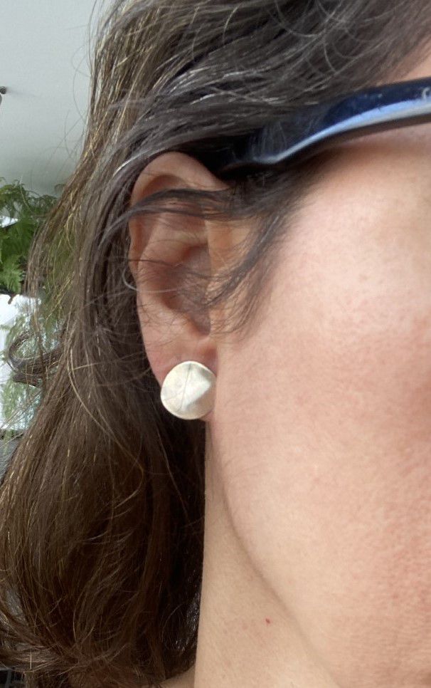 Brinco Lua conhecido pelas clientes como brinco amassadinho, é uma joia feita à mão com Prata Pura (999,9) de tamanho pequeno com acabamento escovado.