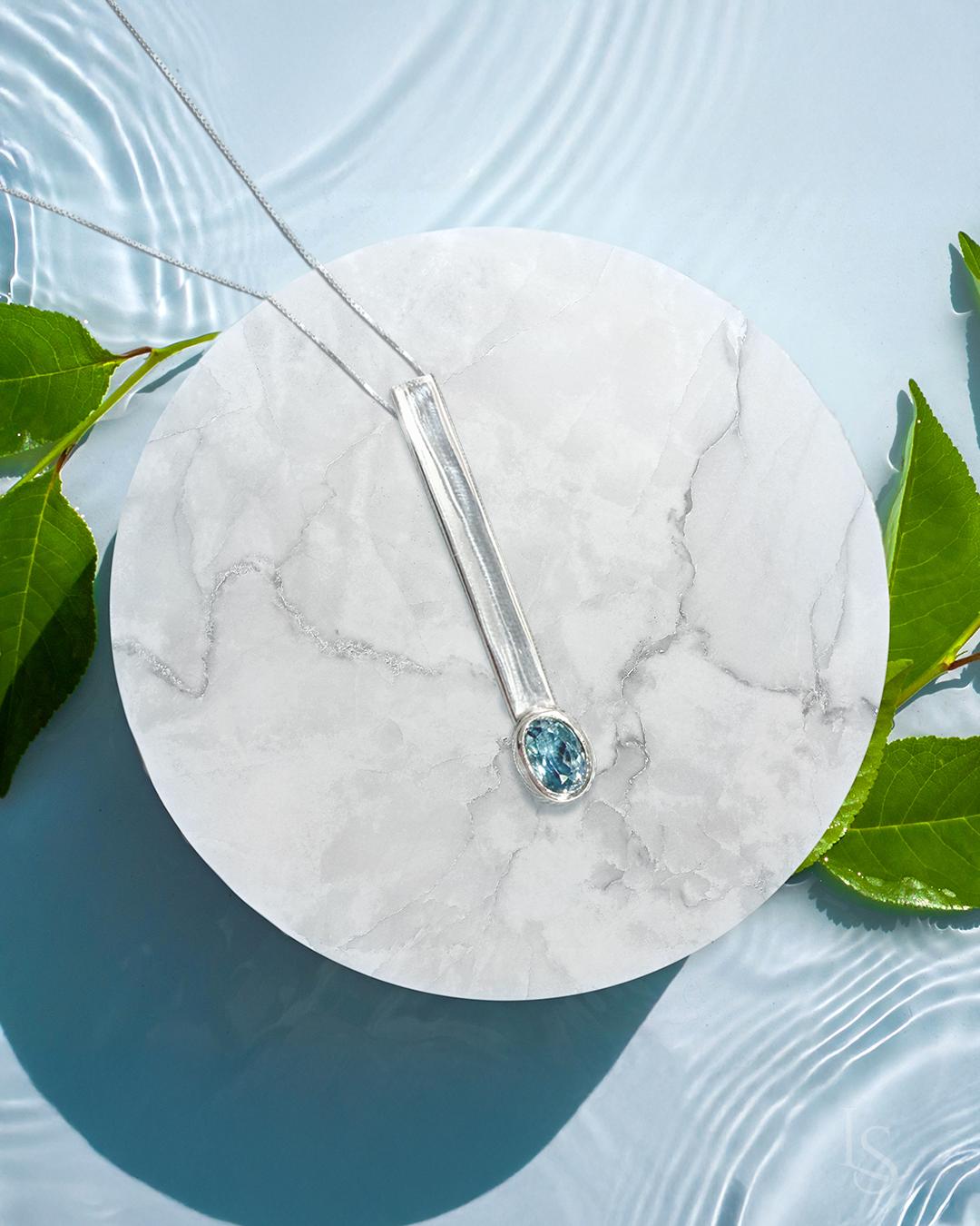 Pingente feito a mão em prata 950 com gema natural, a agua marinha.