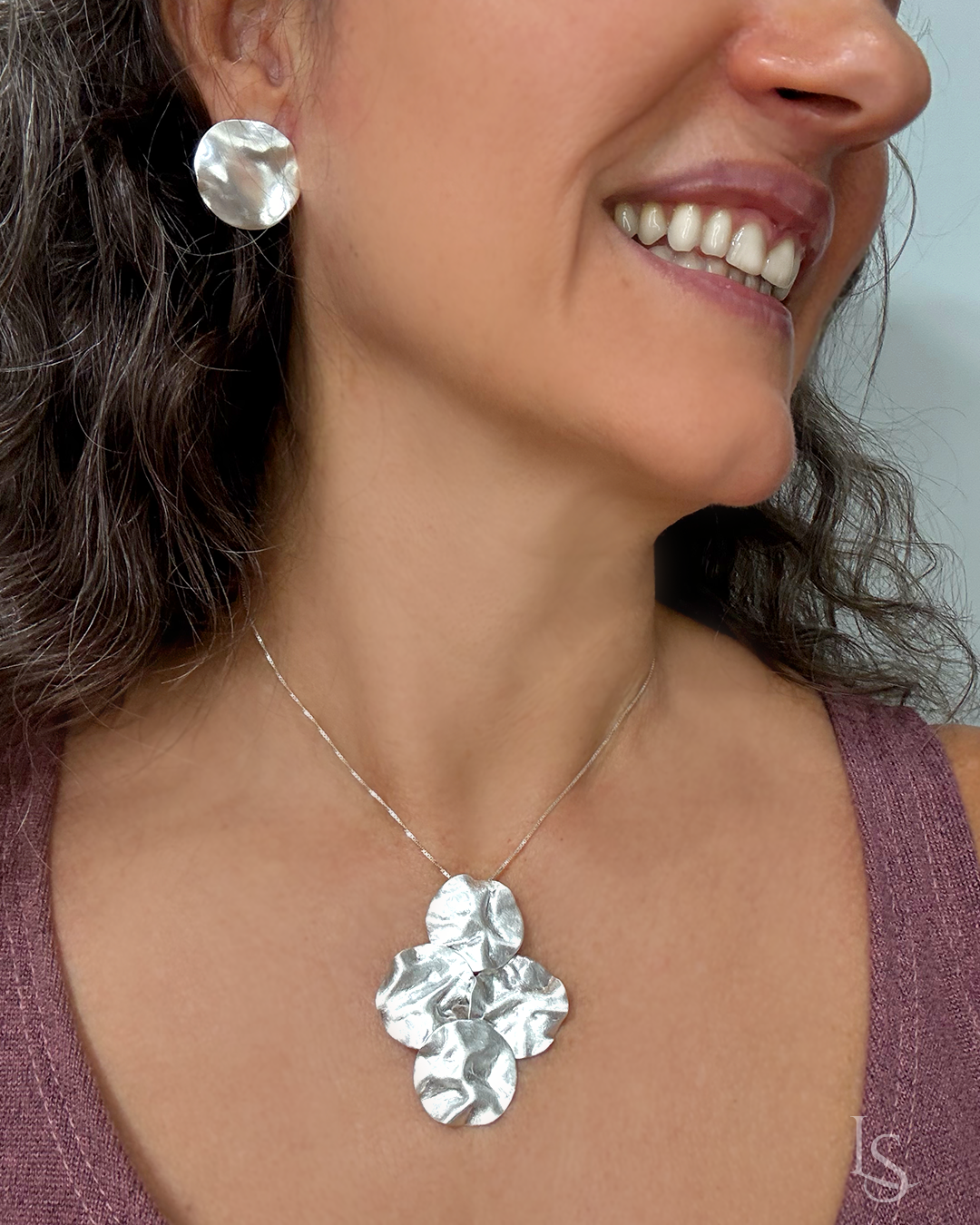 Joia confeccionados à mão, feita uma a uma, com prata pura que tem uma cor especial, um brilho mais branco e permite joias orgânicas. Pingente elegante e com presença, vai do trabalho para uma festa com todo o charme. Feita artesanalmente pela designer em seu ateliê utilizando a técnica de foldforming e ferramentas especiais e o fogo.